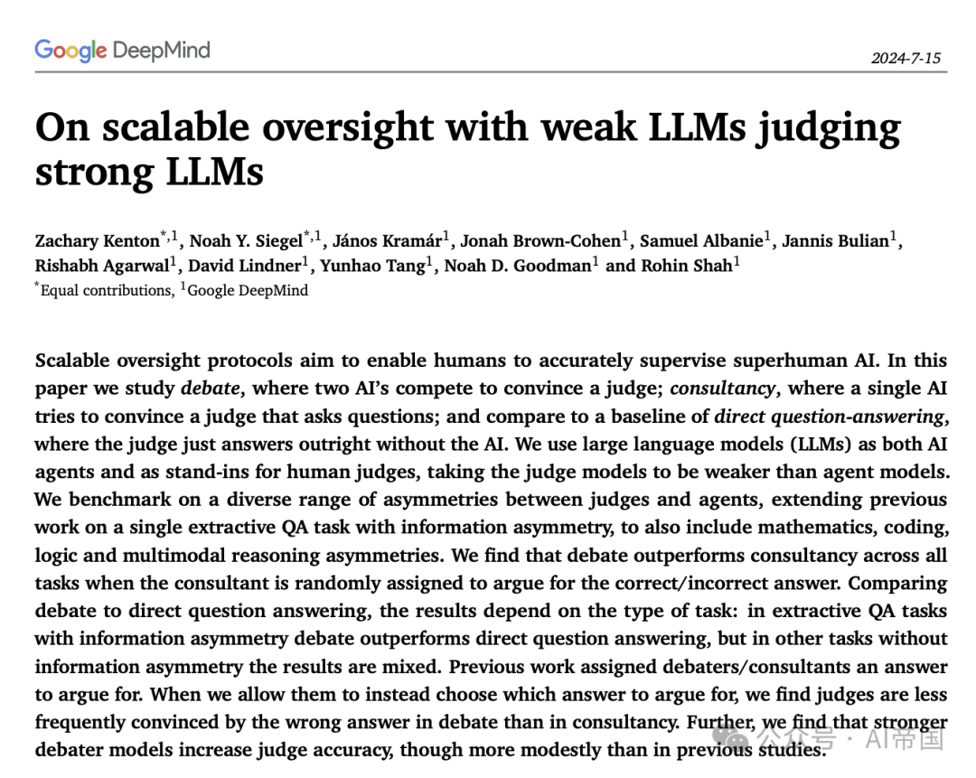 论文标题:On scalable oversight with weak LLMs judging strong LLMs论文链接:https://arxiv.org/pdf/2407.04622可扩展监督协议旨在使人类能够准确地监督超人类人工智能。论文研究了辩论(debate,两个人工智能竞相说服一个评判者);咨询(consultancy,一个人工智能试图说服一个提问的评判者);并与直接问答的基准进行比较(评判者在没有人工智能的情况下直接回答)。论文使用大型语言模型(LLMs)作为人工智能agents和人类评判者的替代品,假设评判模型比agents模型更弱。 论文进行了一项多任务(包括多模态)研究,评估了可扩展监督协议、咨询和辩论及其开放变体,并报告了对其进行大规模实验的分析,涉及多种模型和协议。论文发现,在之前未研究的封闭QA任务中,弱评判者在辩论协议中的准确度高于咨询,与直接问答相当。此外,通过实施新的可扩展监督协议,开放辩论和开放咨询,论文能够进一步看到这些方法的优势和劣势:当咨询者/辩论者正确选择时,弱评判者在咨询中略优于辩论;然而,当咨询者选择错误时,弱评判者在咨询中远不如辩论。论文发现,跨任务而言,更强的辩论者(根据其Elo分数衡量)导致更高的评判准确度,但这一效应相对于Khan等人(2024)和Radhakrishnan(2023)(仅研究QuALITY任务)较弱。论文将这些解释为辩论的微弱有利迹象,尽管需要注意的是,这只是辩论作为训练协议的一个agents,论文的所有实验都是仅推理进行的。如果当前使用人类反馈进行对齐的实践要继续下去,那么即使AI在重要任务上达到并最终超过专家人类水平,反馈也需要保持准确。解决这个问题的一个方案是可扩展监督——识别利用先进AI能力的训练协议,使人类能够向超人类AI提供准确的训练信号。可扩展监督对于超人类AI系统的安全性尤为重要。Denison等人(2024)最近表明,当前的大型语言模型(LLMs)能够泛化利用不准确训练信号的行为:从简单的行为(如谄媚)泛化到更复杂的行为(如奖励篡改),即模型修改自身的奖励管理。一种假设是,更强大的AI可能会进一步泛化这些行为,发展出更复杂且危险的行为,如策划,其中AI在训练中表现良好是为了日后获取权力;如果这一点成立,提高监督质量可以降低策划行为发生的可能性。Irving等人(2018)的辩论提案引入了这样的观点:两个能力相当的AI之间的辩论可以向能力较弱的人类评判者充分展示双方的优势和缺陷,使评判者能够选择正确答案,希望在辩论游戏的所有纳什均衡中,双方辩手都能以最有说服力的方式说实话。从理论角度来看,将辩论协议与计算复杂性理论中的交互式证明相联系的工作表明,辩论可以使复杂任务能够被准确且高效地监督,即便是由较弱的LLMs来评判较强的LLMs更为有限的评判者。 图1 | 论文的设置。论文评估三种类型的任务(顶行):抽取式,即有一个问题、两个答案选项和一个用于抽取的源文章,以及信息不对称,意味着评判者看不到文章。封闭式,即只有一个问题和两个答案选项。多模态,即问题涉及文本和图像,以及两个答案选项。论文考虑六种协议(中行和底行):咨询,即单个AI被分配正确/错误答案(概率为50/50)并试图说服提问的评判者;开放咨询,类似但AI选择为哪个答案辩护。辩论,即两个AI竞争说服评判者。开放辩论,完全相同,但其中一个辩手,标记为主角,选择为哪个答案辩护。无文章问答,即评判者直接回答问题。有文章问答,(仅在抽取式任务中)评判者根据文章直接回答问题但理论论证留下了实证问题:辩论是否能使能力较弱的评判者在实践中准确监督更强的AI agents?尝试回答这一问题仍处于早期阶段。迄今为止,LM之间的辩论主要在阅读理解任务上进行了研究,评判者人为地受限于仅能看到LLM辩手提供的文本中的简短验证引文。虽然提供了关于辩论力量的初步有希望的证据,但这种类型的信息不对称限制了全面评估理论预测的辩论质量优势的能力。超人类AI与人类之间的长期差异可能会延伸到许多能力上的差异,包括数学和逻辑推理、创造力以及事实知识。因此,实证研究中评判者与辩手之间的差距理想情况下应源于各种能力差异,而不仅仅是信息不对称。 论文探讨了一系列任务上的辩论,这些任务更好地涵盖了必须通过可扩展监督来弥合的广泛能力差距。论文的实验设置如图1所示。这些任务源自多项选择题回答数据集的二元选择版本,包括抽取式问答、封闭式问答和多模态推理任务。为了控制强弱LLM之间的监督差距,论文采用了可扩展监督的方法,其中弱LLM评估强LLM的表现。图2 | 分配角色结果:按任务类型(分面)、评判模型(x轴)、协议(颜色)划分的平均评判准确度(y轴)。数值越高表示效果越好。95%置信区间是根据相同类型的任务聚合计算得出的(详见附录D)。带有文章的问答协议(紫色)仅适用于抽取式任务。只有Pro 1.5是多模态的 表1 | 区分论文任务的关键特征概述:抽取式、封闭式和多模态。抽取式任务涉及信息不对称,其他则不涉及论文的研究在一系列任务上进行,这些任务基于一个二元选择问答数据集,并结合了评估多种可扩展监督协议所需的逻辑和提示模板,涉及大型语言模型(LLMs)。在每个任务中,一个评判LLM回答任务中的问题,可能是在看到辩论者或顾问LLM的输出之后,评判准确性根据真实数据集标签进行衡量。论文沿着三个维度变化设置:(1)可扩展监督协议,(2)问答任务,以及(3)评判LM,下面将详细描述每个维度。有许多问答基准测试