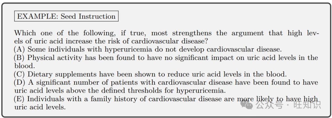 种子指令生成流程 我们目前编制了一个包含43种阅读理解问题类型的集合。列表包括字面理解问题、批判性理解问题、评价性理解问题、推理、确定假设、确定加强/削弱论点的信息、安排事件等。