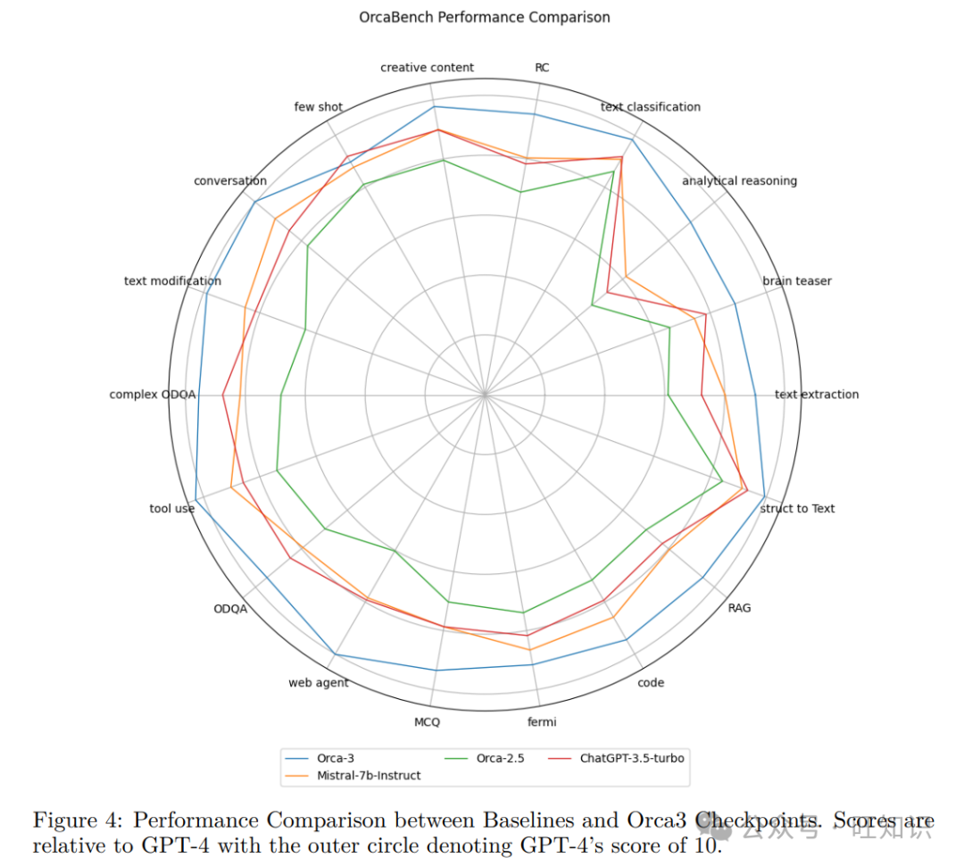 AgentInstruct的目标是综合一个大而多样化的数据集合,难度各异。有效执行这一策略应该产生一个数据集,与GPT-4相比,基线模型如Orca-2.5、Mistral-Instruct-7b和ChatGPT的得分将大幅低于10,证明它们相对于GPT-4的劣势——GPT-4被指定为基准模型,得分为10。性能比较如图4所示,展示了基线模型与Orca-3之间的比较分析。该图显示了在后训练期间,通过AgentInstruct数据,在广泛的能力范围内的显著增强。