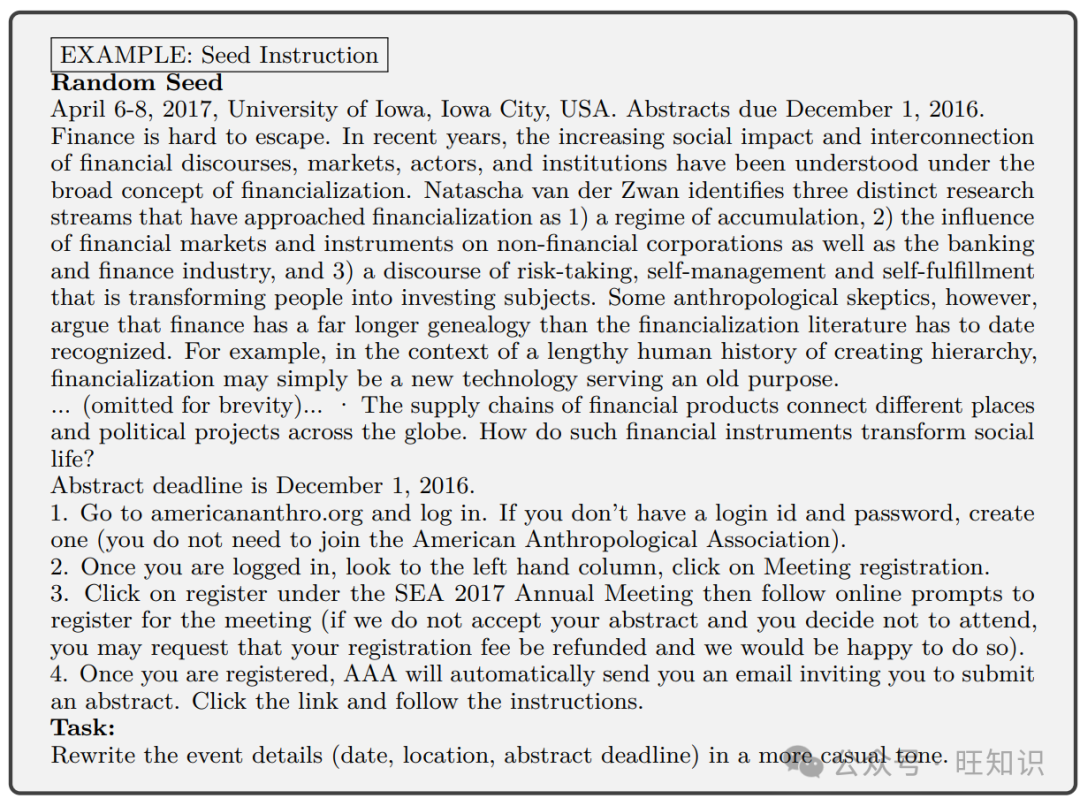 种子指令生成流程 我们目前编制了一个包含18种文本修改任务的集合,包括释义、扩展、简化、编辑或删除内容、风格转换等。完整的列表在附录A中。