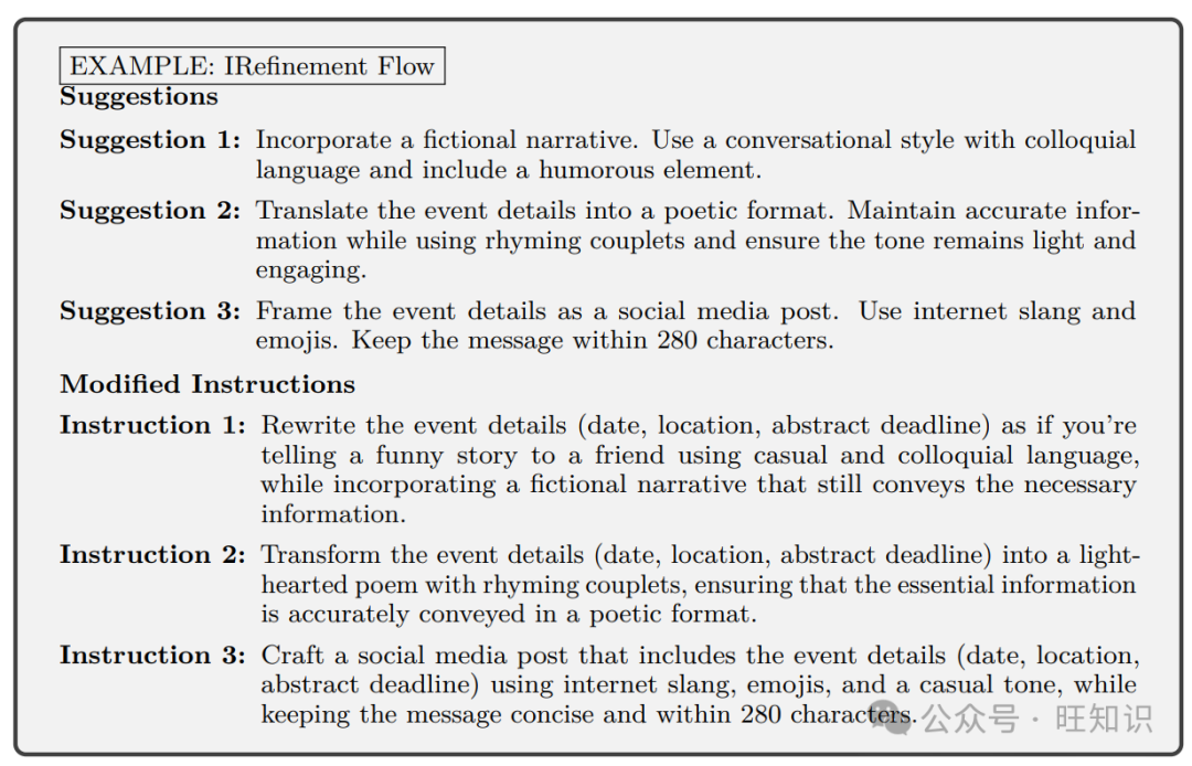 指令改进流程 改进流程只由一对建议者-编辑者组成。建议者-编辑者二人组在输入文本和任务修改指令的基础上增加生成指令的复杂性。这里我们展示了建议者-编辑者对提出的三个建议和编辑。