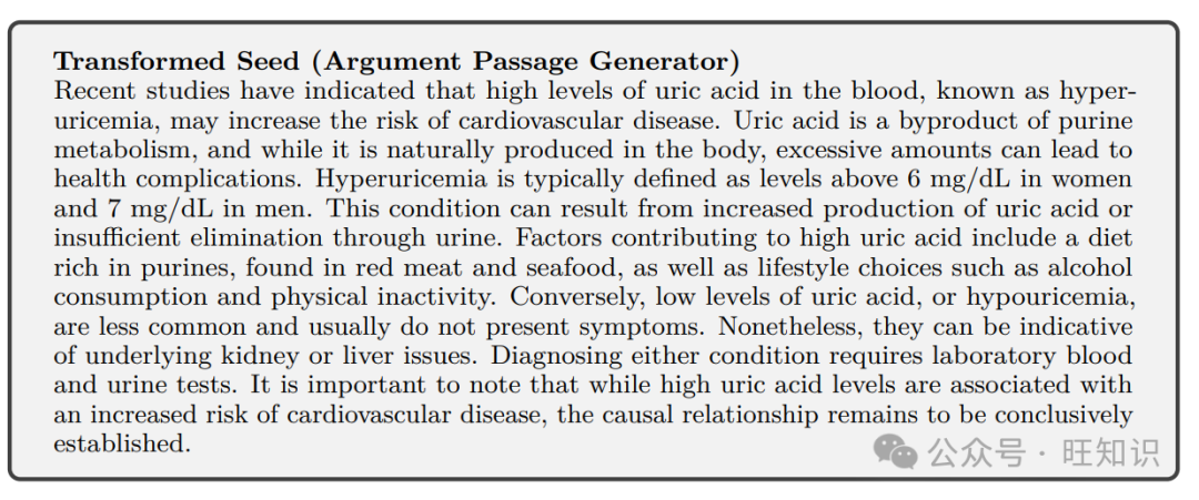 我们当前的阅读理解流程包括九个内容转换智能体,用于生成论证段落、辩论和对话、长段落、会议记录、诗歌、讽刺内容等。附录A中提供了详细描述。给定一个种子文章,流程将随机选择一个内容转换智能体来评估种子文章,并尝试生成文本段落。以下提供了论证段落生成器的示例。