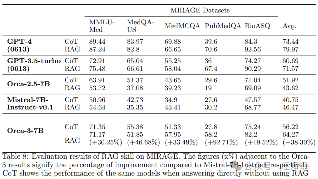 表8: 在MIRAGE上评估RAG技能的结果。Orca-3结果旁边的数字(x%)表示与Mistral-7B-Instruct相比的改进百分比。CoT显示了相同模型在不使用RAG时回答问题的性能。