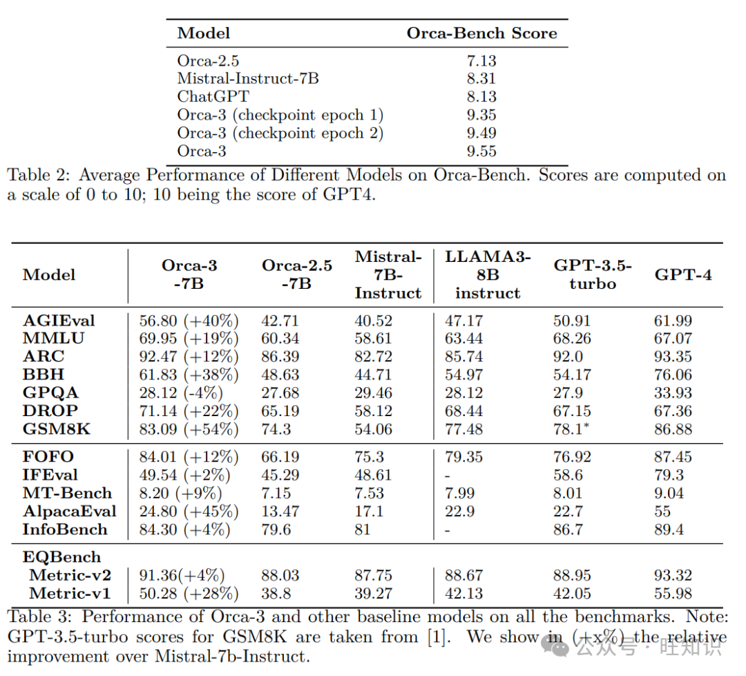 表3: Orca-3和其他基线模型在所有基准测试中的表现。注意:GPT-3.5-turbo在GSM8K的得分取自[1]。我们在(+x%)中显示了与Mistral-7B-Instruct相比的相对改进。