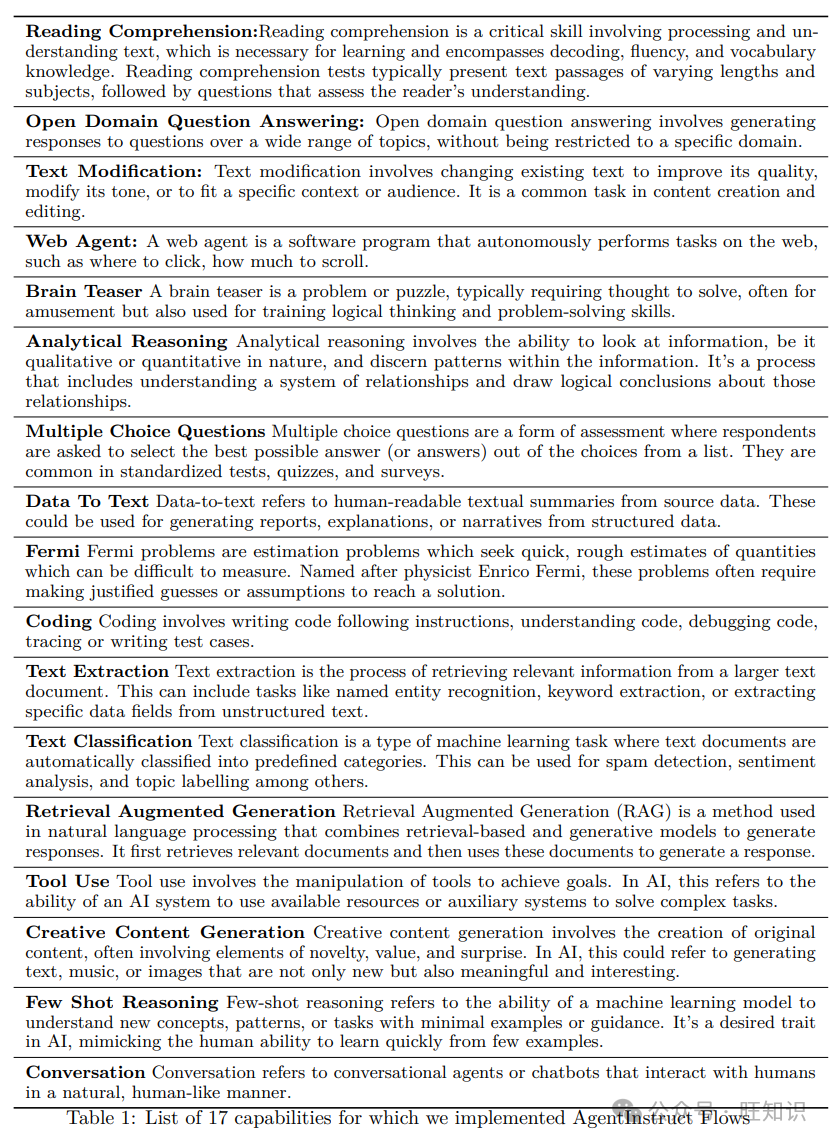 表1: 我们为以下17种能力实现了AgentInstruct流程的列表。