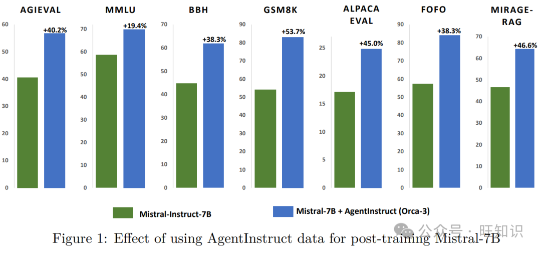 图1:使用AgentInstruct数据对Mistral-7B进行后训练的效果