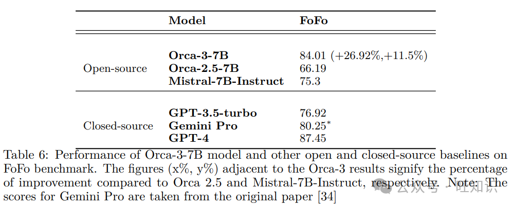 表6: Orca-3-7B模型和其他开源及闭源基线在FoFo基准测试上的表现。Orca-3结果旁边的数字(x%, y%)表示与Orca 2.5和Mistral-7B-Instruct相比的改进百分比。注意:Gemini Pro的分数取自原始论文[34]。