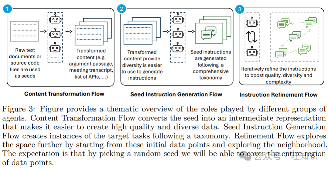 图3:提供了不同组智能体所扮演角色的主题概述。内容转换流程将种子转换为中间表示,使其更容易创建高质量和多样化的数据。种子指令生成流程根据分类法创建目标任务的实例。改进流程通过从这些初始数据点开始并探索邻近区域来进一步探索空间。期望通过选择一个随机种子,我们将能够覆盖整个数据点区域。