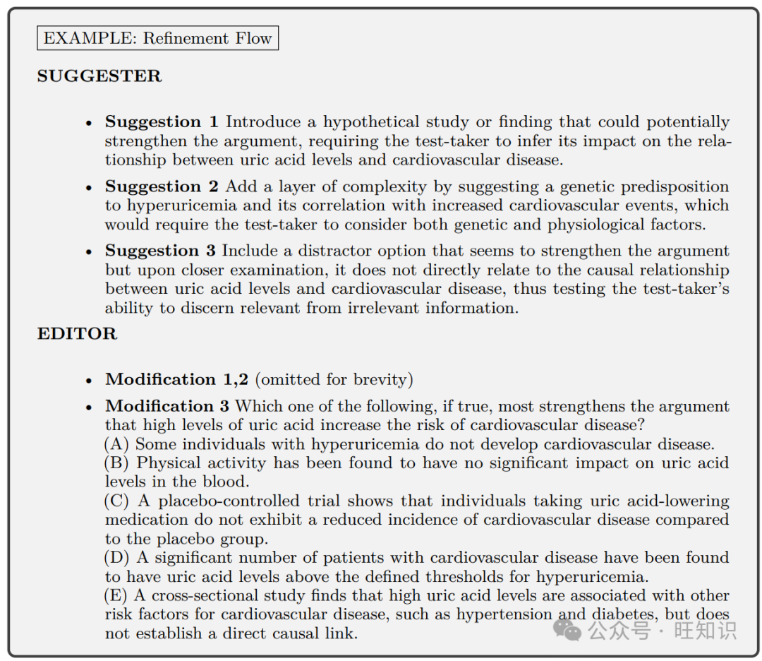 以下是一个示例,其中建议者智能体试图增加一个难以排除的干扰项来混淆考生。
