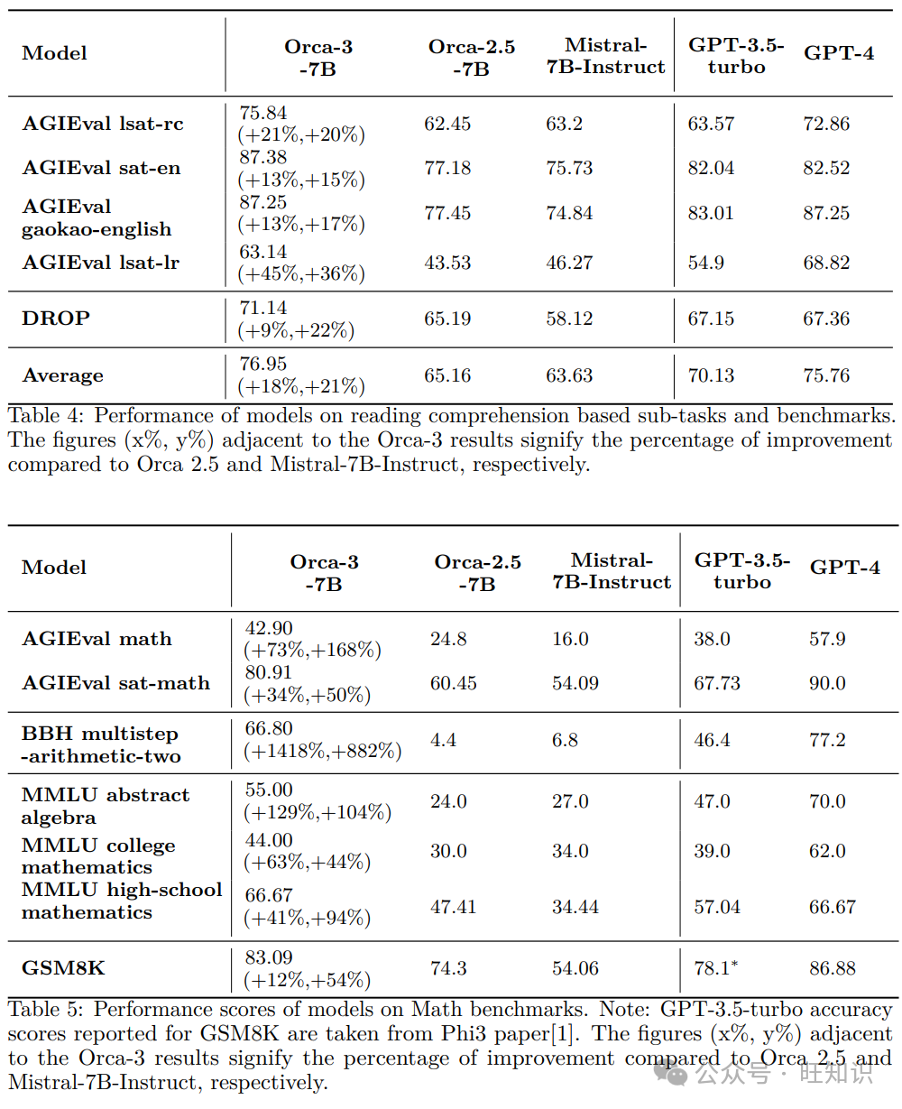 表4: 模型在基于阅读理解的子任务和基准测试上的表现。Orca-3结果旁边的数字(x%, y%)表示与Orca 2.5和Mistral-7B-Instruct相比的改进百分比。表5: 模型在数学基准测试上的表现分数。注意:GPT-3.5-turbo在GSM8K的准确度得分取自Phi3论文[1]。Orca-3结果旁边的数字(x%, y%)表示与Orca 2.5和Mistral-7B-Instruct相比的改进百分比。