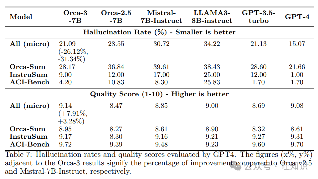 表7: 由GPT4评估的幻觉率和质量得分。Orca-3结果旁边的数字(x%, y%)表示与Orca v2.5和Mistral-7B-Instruct相比的改进百分比。