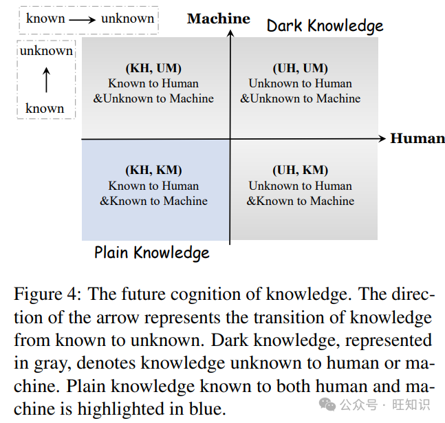 数据的分布和质量对于知识获取和模型(机器)的稳健运行至关重要。想象一个理想场景,我们可以使用各种数据来训练机器。数据包括所有可能的模态,如文本、图像、音频、视频等。模型也可以相互交互并与外部环境交互。在这个长期发展中,未来智能体是否还会有人类或机器不知道的暗知识?我们假设,未来智能体的智能中仍然会存在暗知识。如图4所示,暗知识描述了人类或机器未知的知识,来自以下三种情况:1)人类不知道而机器知道(UH, KM)。机器利用大量数据探索内部模式,而人类由于数据处理能力和计算限制,难以处理这些数据。(UH, KM)包括基因预测、智能交通系统等。具体来说,蛋白质的三维结构长期以来对人类来说一直是个谜。冷冻电镜通过捕捉数百万张图像,首次揭示了蛋白质的三维结构。现在,神经模型可以高效准确地直接预测蛋白质属性(Pak等人,2023)。2)人类知道而机器不知道(UH, KM)。一方面,一些学者声称机器可以拥有“心理理论”能力(Zhu等人,2024)和情感(Normoyle等人,2024)。另一方面,批评者认为机器缺乏感知能力,只是以概率方式生成标记(Wang等人,2024d)。具体来说,一些抽象知识如饥饿、幸福、孤独等无法通过离散数据点完全表示。上述知识类似于NP-hard问题,也是极其复杂和几乎不可能用当前算法完美建模的。因此,反对者认为,无论机器拥有多少参数,它都无法学习人类已经掌握的所有知识。3)人类不知道且机器不知道(UH, UM)是超出我们认知的。通常,暗知识超出了当前数据和模型架构的范围。(UH, UM)需要人类-机器协作。然而,关于(UH, KM)和(KH, UM)是否会通过模型架构、训练数据和计算资源来解决,还没有明确的结论。注意,图4中人类和机器都知道的普通知识包括明确定义的历史事件、数学定理、物理定律等。