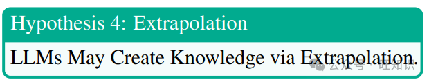 知识创造(Runco和Jaeger,2012;Sternberg,2006;Gaut,2010)强调形成新颖和有价值的事物的能力和过程,而不是LLMs已经见过的现有事物(如在§3.1和§3.2中讨论的)。创造包括两个层次:1)LLMs根据LLMs理解的当前世界原则创造新术语,例如新的蛋白质(Shin等人,2021;Madani等人,2023)、分子(Bagal等人,2022;Fang等人,2023;Edwards等人,2022)、代码(DeLorenzo等人,2024)、视频(Kondratyuk等人,2023)、模型(Zheng等人,2024)、人和公司的名称、书面故事(Gómez-Rodríguez和Williams,2023;Buz等人,2024)、合成数据(Stenger等人,2024;Mumuni等人,2024;Abufadda和Mansour,2021)等。这些新颖项目根据现有规则运作,例如能量守恒定律、推理逻辑(Wang等人,2024a)或概率论原则。2)LLMs可能会生成新规则,例如数学定理,由此产生的术语将根据新规则运作。我们认为,LLMs的知识创造可能源于外推假设。