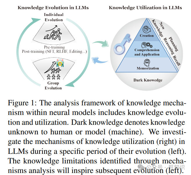 图1:神经模型内知识机制的分析框架包括知识演化和利用。暗知识表示人类或模型(机器)不知道的知识。我们研究了LLMs在特定演化阶段的知识利用机制(右),以及通过机制分析确定的知识局限性将激发随后的演化(左)。