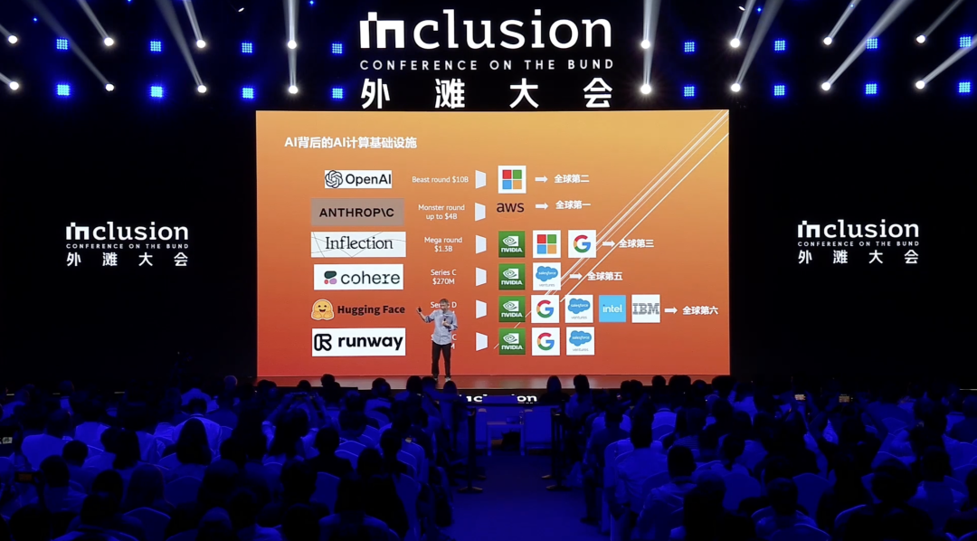 大家回过头来看,在云时代、移动时代和AI时代,大家讨论的基础设施是什么?这里很有意思的是,大家甚至把苹果和英伟达也划到了基础设施这一类中;这种分类方式让人觉得有趣,但并不奇怪,为什么呢?作为做云计算的我,看到这样一张图时,感到非常激动。这张图不是我画的,但我看完之后,觉得它表达的意思和我的理解完全一致。你们可以看到,这张图列出了美国六家做AI的独角兽企业,而背后的基础设施支持也很耐人寻味。