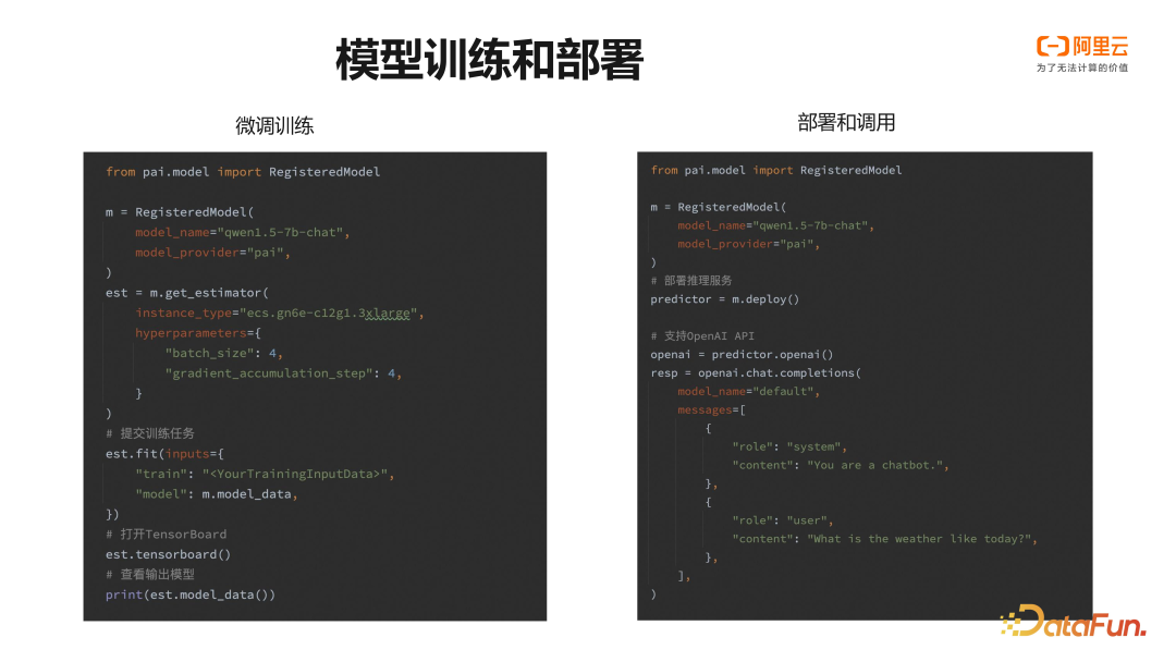 以下是 Qwen1.5-7B-Chat 模型的 SDK 调用示例,我们通过数行代码即可调用PAI 预置的镜像和脚本完成对模型的微调训练和部署。通过 RegisteredModel 对象配置 model_provider=“pai“,即可获得 PAI ModelGallery 提供的模型。模型可以通过 deploy 方法直接部署,也支持通过 get_estimator 方法获取模型关联的微调算法,指定 OSS,NAS,或是 MaxCompute 表数据后提交模型微调训练任务,产出的模型将被保存到用户的 OSS Bucket 中。