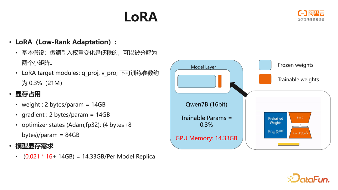 以 Qwen(千问) 7B 为例,如果我们在 q_proj 和 v_proj 这两层上添加 LoRA 的 Adapter,那么整个模型的可训练参数将占模型总参数的约 0.3%,即约为 21 million。由于只有这 21 million 是可训练参数,才会产生梯度和优化器的显存占用,因此,这些可训练参数的显存占用会大大降低,降至约 0.3GB。结合模型本身的权重 14GB,使用 LoRA 后,可以将显存占用降低到约 14.3GB。