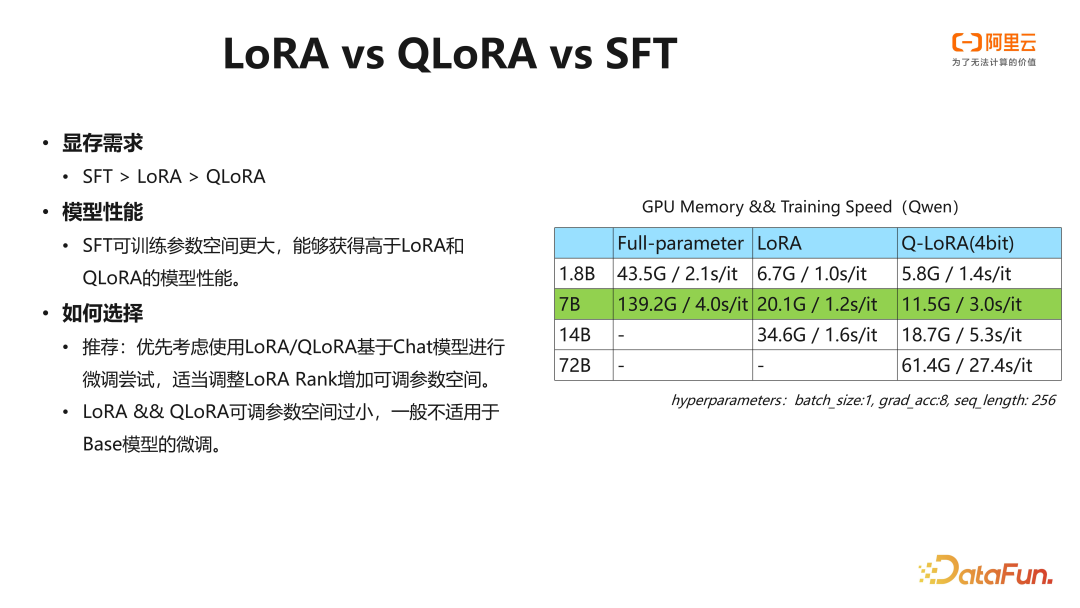 下图中的表格列出了 Qwen(千问)模型在实际运行过程中使用不同训练方式的显存占用分值和训练速度之间的比较。与前文所述是一致的,当然也存在一些偏差,主要源于的超参数、序列长度、显存分配等影响。