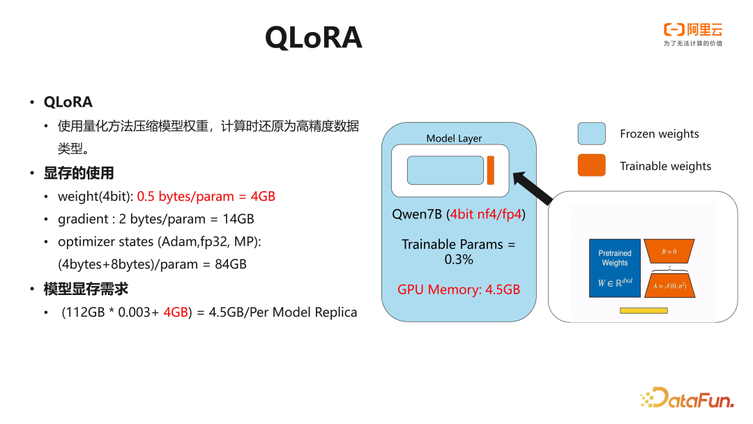 以 Qwen 7B 为例,通过使用 QLoRA 对模型进行训练,其实际模型的权重仅需 4GB,结合可训练参数的显存占用,每个模型的副本仅需 4.5GB 的显存占用。