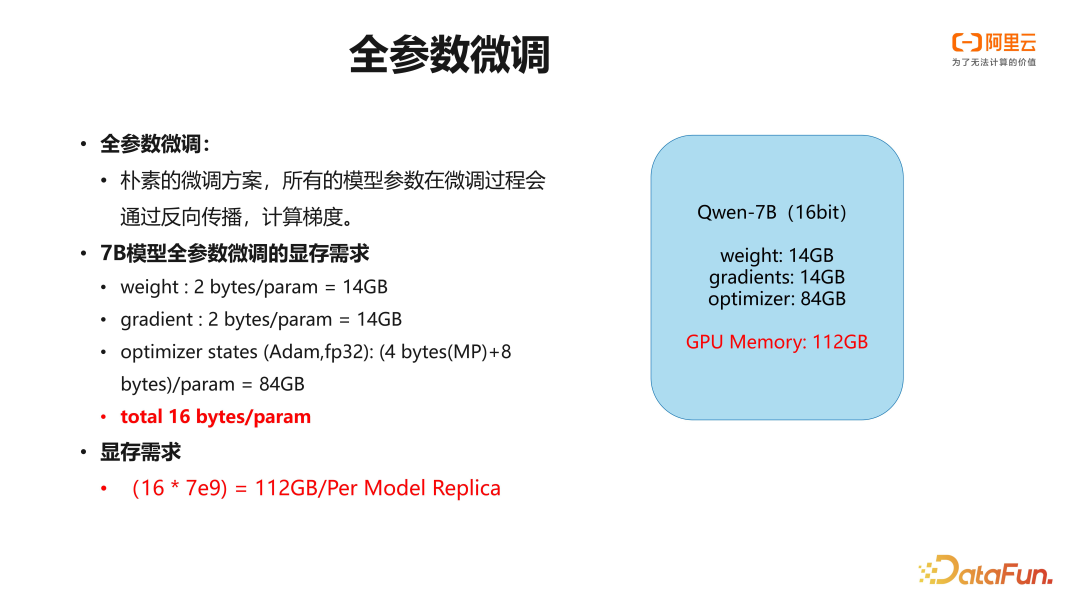 首先,最为基本且常见的一种微调方法是全参数微调。在训练过程中,全参数微调不会冻结参数,也不会为参数添加新的层,因为每个参数都会直接参与模型的训练。当使用 Adam 优化器时,使用混合精度进训练,每个参数对应的模型权重、梯度、优化器状态需要占用 16Bytes 的显存空间。以 Qwen(千问) 7B 为例,每个模型的副本实际占用的显存空间高达 112G,这至少需要两张 80GB 显存的 A100 才能完成对 7B 模型的全参数微调。