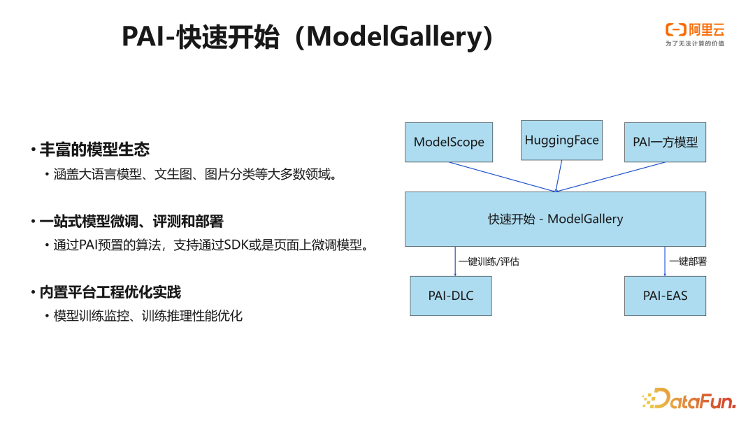 如前所述,机器学习的模型开发应用的范式逐步迁移到以模型为中心。越来越多的开发者倾向于基于预训练模型开发自己的模型或直接将模型进行部署应用。为此 PAI 也提供了新的产品支持——PAI 快速开始 ModelGallery。ModelGallery 提供了大量的预训练模型,包括大语言模型、文生图模型、图片 caption、语音识别等,并支持模型一键微调训练,以及一键部署创建推理服务。
