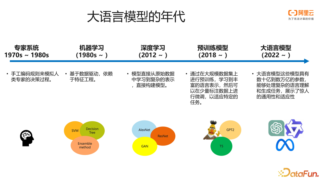 在机器学习的发展过程中,模型的开发与应用模式一直在不断迭代。传统的机器学习年代,机器学习工程师在采集数据之后,需要通过特征工程处理数据,使用模型训练。在深度学习的年代,计算资源更加丰富,模型层数增加,模型能够支持直接从原始的数据中端到端地进行训练,而不大量依赖于特征工程。到了预训练模型的阶段,在模型开发流程中,工程师更多得采用在基础的预训练模型上,使用少量数据微调的方式构建下游应用的模型。
