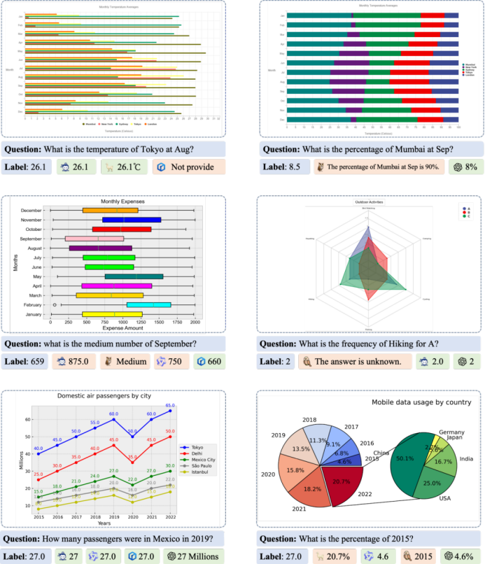 近年来,通用生成式人工智能大模型在语言处理领域展现出了惊人的语义理解和逻辑推理能力,吸引了越来越多企业和研究者的关注。多模态大模型更是通过将图像转换为与文本形式相似的Token,成功实现了对自然图像内容的理解,在多个多模态数据集(如MME、SEED等)上展现了令人信服的性能提升。尽管如此,多模态大模型在实际应用中仍面临诸多挑战,其中可信的图表理解就是一个亟待解决的问题。现有文档中常常包含大量嵌入式图表,以提供更直观和详尽的数据和信息描述。对于自然图像的描述,通常基于可识别的语义对象及其相对位置或作用关系。然而,与自然图像不同,图表通过可视化格式呈现详细而复杂的数据叙述,主要依靠视觉逻辑(如趋势线、图例颜色等元素)来表达数值和实体的映射关系。在我们的测试中,多模态大模型常常无法准确读取图表中的数值,尤其是在没有数据点标注的图表中,其生成的幻觉回答非常严重。当前的多模态大模型严重依赖其OCR能力,但缺乏类似人类的图表逻辑推理能力。因此,合理评估多模态大模型在数据可靠性和内容理解方面的表现至关重要。目前,主流的工作主要使用 ChartQA 等数据集评测多模态大模型的图表理解能力,但是其有着一些固有的缺陷,如图像来源单一、图表类型较少和评估方法不够合理等。特别的,图表上丰富的数据点标记容易导致评测题目退化为简单的 OCR 问题,从而导致无法正确评测模型的视觉逻辑推理能力。基于以上考虑,我们提出了一个新的用于评估多模态大模型图表认知与推理的数据集ChartBench。概述: