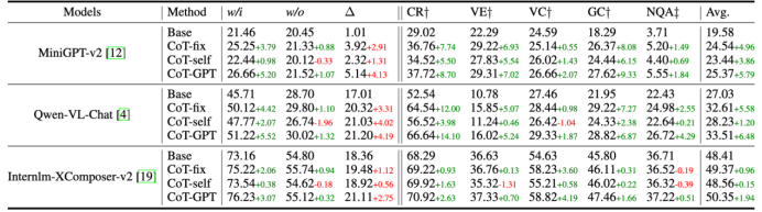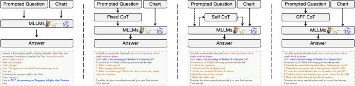 ChartBench主要评估模型理解无数据点标注图表的能力。我们提出了两个简单而有效的基线,可以显着提高模型的性能。ChartCoT:如下图所示,我们提出了基于思维链的有效基线,在不调整模型的情况下增强视觉推理能力。我们设计了一系列的问题以分解用户查询,并使用提示来模拟人类的视觉推理来进行图表识别。此外,我们使模型能够生成自己的思维链,或者寻求更大模型的帮助来生成思维链。这种方法有效地帮助模型理解图表,特别是在视觉逻辑更复杂的情况下。
