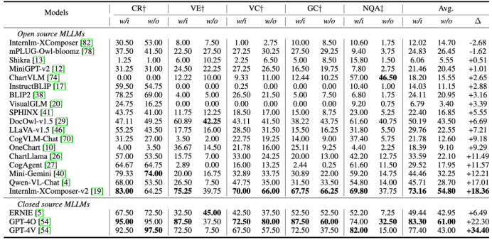Acc+: 我们改进了MME的评测方法,以避免昂贵的大模型评估。对同一个问题采用正反两种提问方式,只有模型能同时正确回答这两种提问,才被认为正确回答了问题。3)不正确的值不是随机生成的,而是从真值的邻域采样的。Confusion Rate: 我们发现,许多模型对两个提问产生相同的输出,可能是因为它们没有利用图表的视觉信息。为了评估这种情况,我们引入了混淆率(CoR)作为度量标准。如果模型没有使用图表中的信息,它往往会生成相同的答案,从而导致CoR接近100%。GPT-acc: 虽然Acc+是一种评估模型响应的有效方法,但它在特定的数值问题上有所不足,因为正确回答负样本并不能完全证明模型的泛化能力。为了解决这个问题,我们改进了ChartQA中的误差范围评估。我们的改进包括:1) 使用大模型来过滤回答并提取数字答案,避免由于额外文本而导致的模式匹配错误; 2) 数值问答任务排除了年月等元素,这类问答可能因为误差范围变得过于宽松,使评估缺乏意义。基线模型