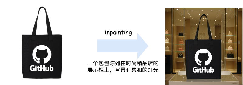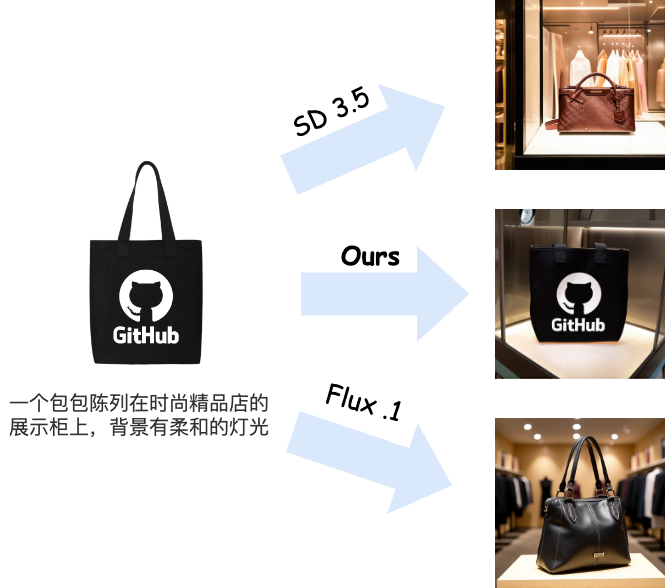 现有的文生图技术已经较为成熟,Flux、SD 3.5 和 Midjounery 等最先进文生图模型已经可以生成足够“以假乱真”的图像。在淘系内部,现有文生图模型已经被应用于各种需要创意图像的业务,例如 AI 会场等。但是,文生图技术的缺陷在于文本作为控制条件的指导性仍然较弱--例如我们无法仅利用文本生成一个带有“GitHub”样式的包包的营销图(见图1)。