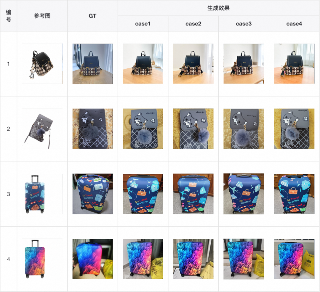 我们首先展示模型在测试集上的效果,可以看出模型可以较好的保持背包的形状、图案和文字等的一致性,甚至比 GT 更像 GT(例如表格第4行)。