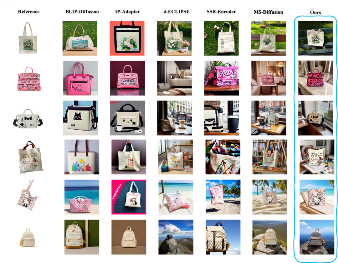 我们提出了一种新颖的参考图生成方案,能够实现细粒度的商品一致性生成,在较好地还原物品的形状、纹理、花纹文字的同时,融洽的将商品融入到文本提示的环境中。