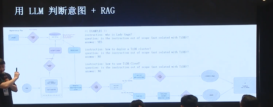 上图列举了一些使用 prompt 的例子,包括 TiDB 的描述等没有在图中展示出来的细节;对于 RAG 部分,图中的几个 example 是根据用户问题,通过向量相似度提取,即可简单直接地判断该问题是否和 TiDB 相关。