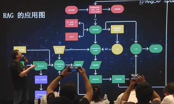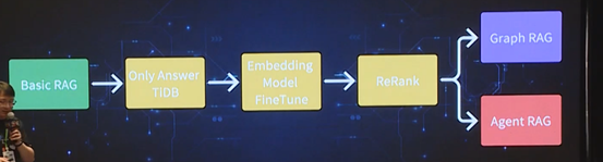 上图中对我们所有的 RAG 应用进行了总结。其中绿色部分是最初的 Basic RAG 的流程,为了优化这一流程,在此基础上增加了黄色部分,包括判断是否 TiDB 相关、finetune Embedding model、ReRank 内容,因为是以业务为目标,所以在语料、模型以及工程等每个环节都进行了优化。