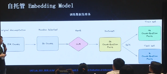 由于团队人数有限,为了尽可能减少人工的工作,因此最终选择了机器学习领域常用的 GenQ 方法,首先对所有文档进行分块(chunk),随后随机挑选部分文档进行进一步切分,最后使用 GenQ 方法生成文档及其对应的 question,从而获得 chunk-question pairs,进而将其拆分成 Train set 和 Test set,对模型进行训练。
