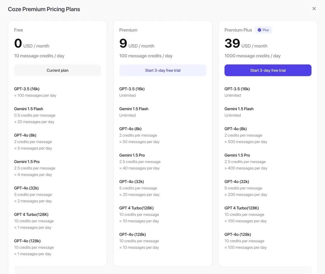 可以看到,这次Coze的定价分为三个等级:免费、Premium和Premium Plus,每个等级有不同的每日消息额度和使用价格。