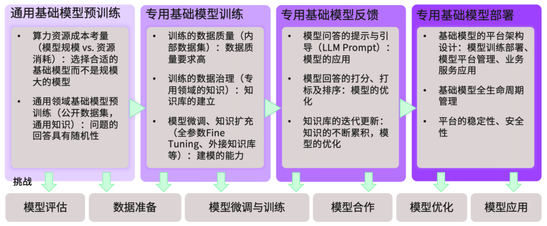构建企业级AI大模型的整体框架主要包括,通用大模型的预训练,专用基础模型的训练,专用基础模型的反馈,专用基础模型的部署几个步骤。而目前大部分开源的AI大模型都是通用基础模型,这些模型已经经过了预训练了。那么我们大部分企业级的应用级的AI大模型都是基于开源预训练之后的大模型。