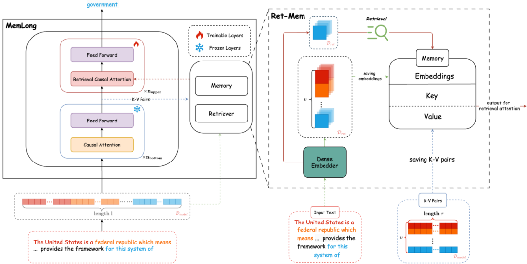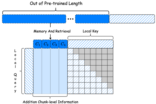 - 注意力重构:在模型的可训练上层,修订了注意力机制以融合长期记忆,提出了一种检索因果注意力机制,使每个标记能够同时关注局部上下文和块级别的过去上下文。