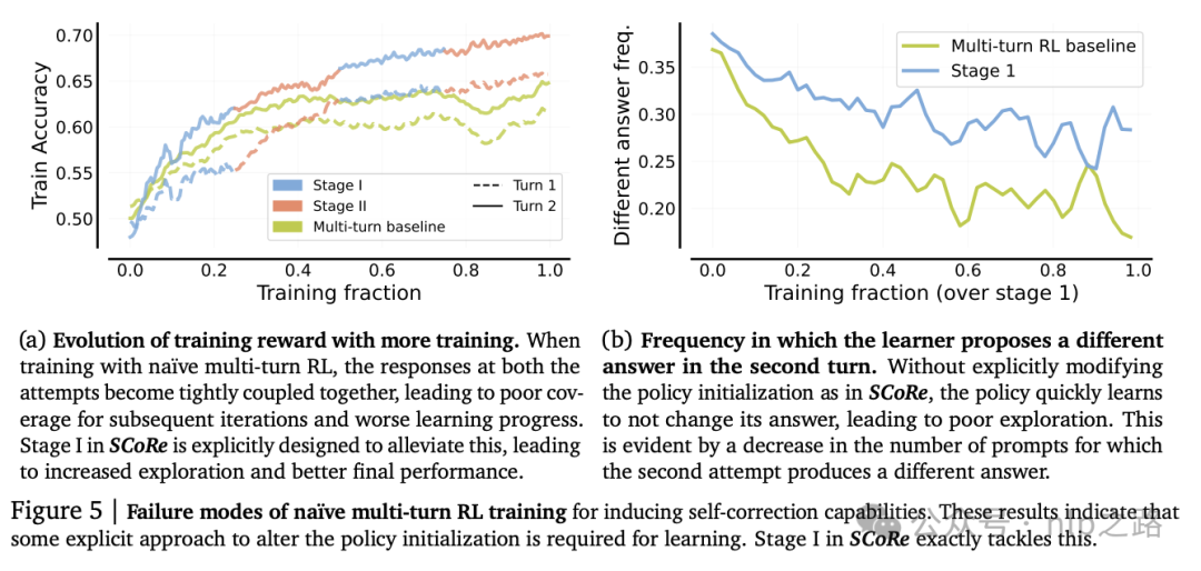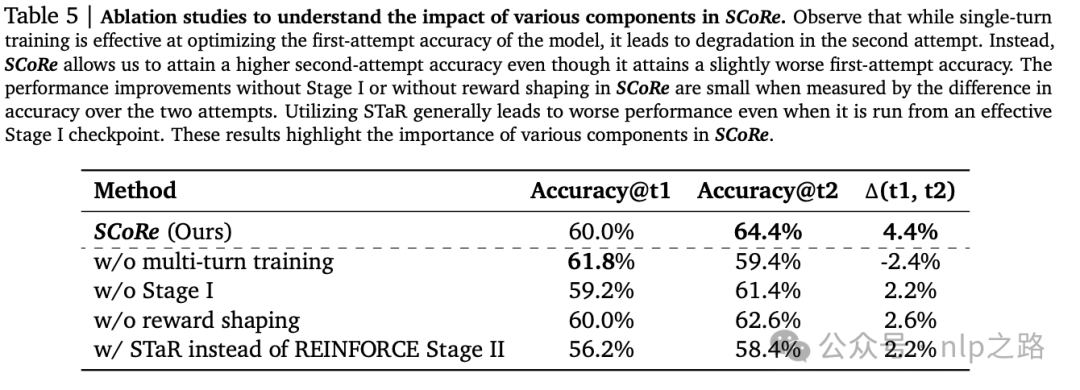 (2)多阶段训练的重要性:第一阶段对SCoRe有多重要?换句话说,为什么不直接运行第二阶段?;