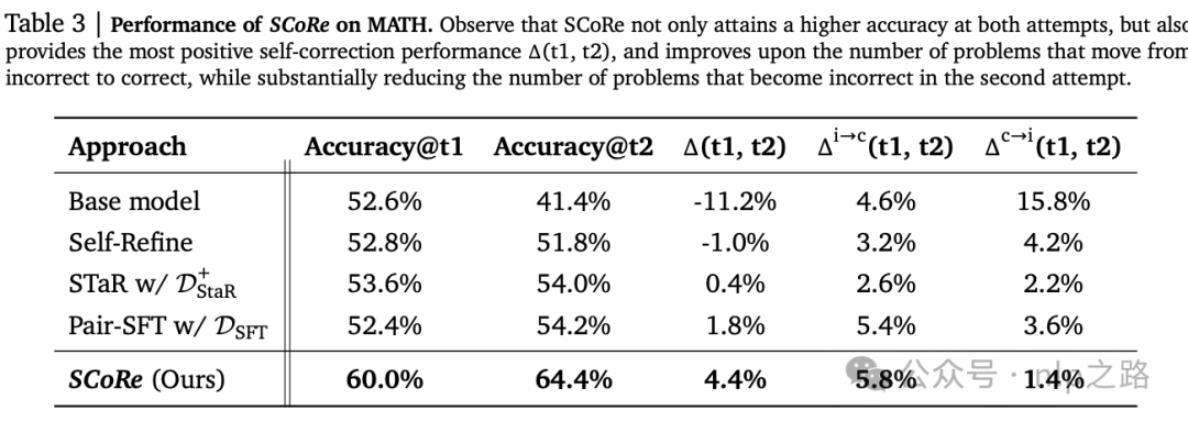(2)第一阶段对SCoRe至关重要;没有它,模型实现了2%较低的Δ(t1, t2)和3%较低的accuracy@t2。