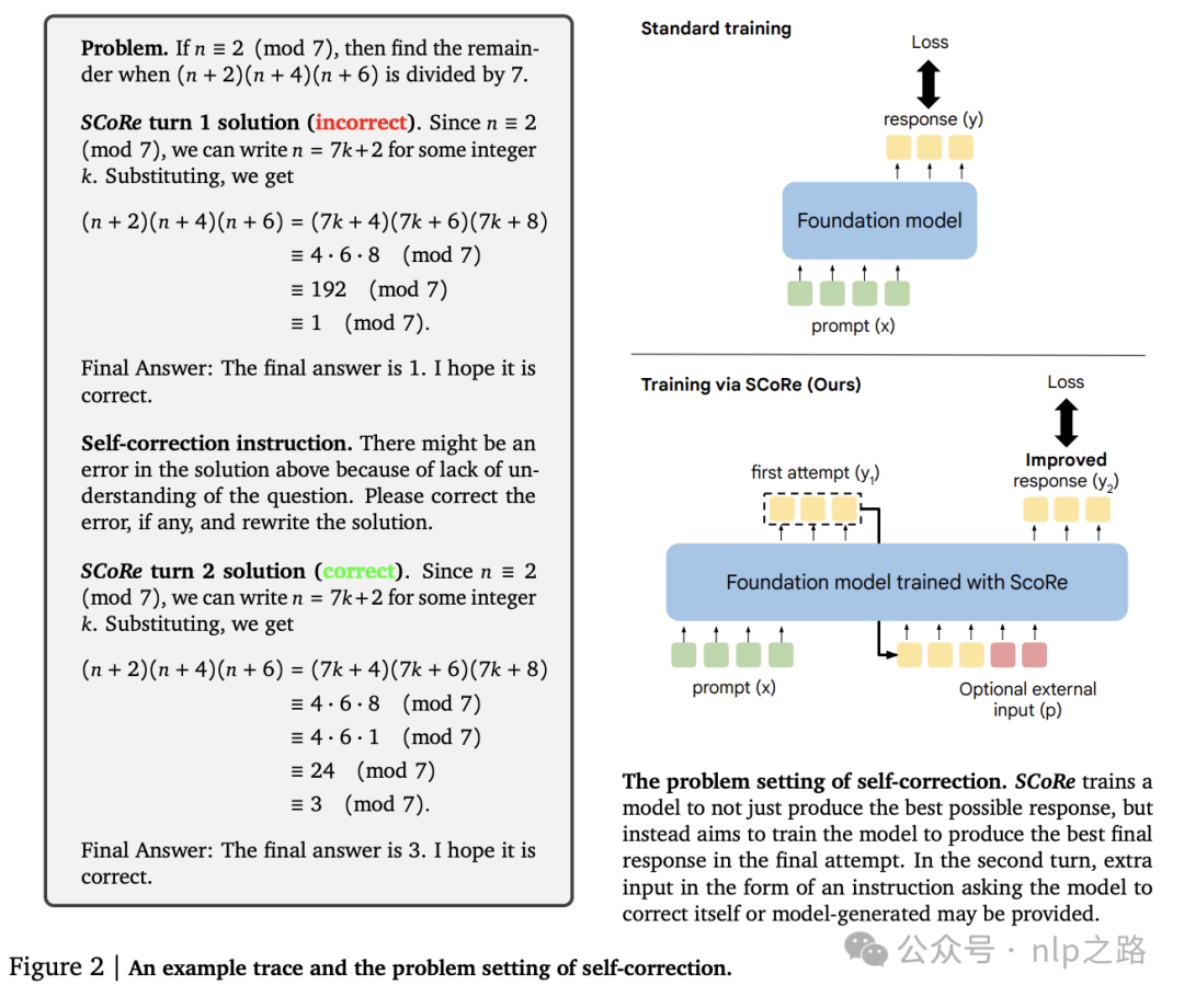,例如基于字符串匹配的答案检查功能,通过比较模型的输出和正确答案来评估正确性。模型学会了推断是否存在错误并进行修正,测试时就可以不需要奖励函数了。如图2所示。