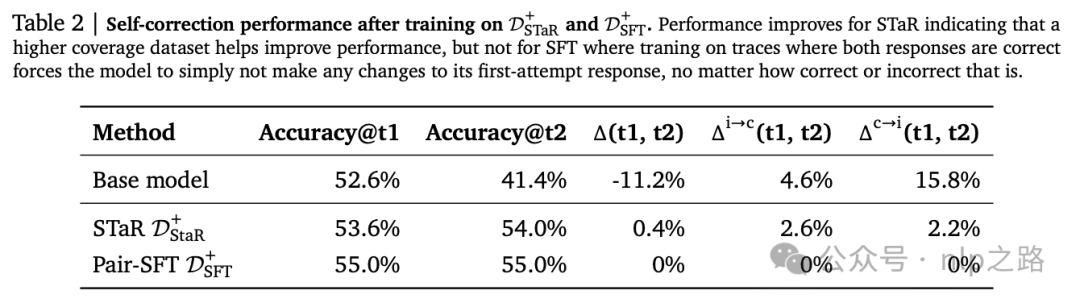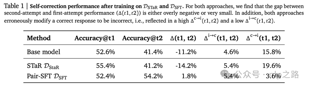 结果如上表所示。尽管Pair-SFT的Δ(t1, t2)相对于基础模型有大幅度提高,但进行自我修正几乎没有好处(1.8%的增益)。通过考虑Δi→c和Δc→i,SFT主要通过减少在修订后错误地将正确问题更改为不正确的问题的数量来提供帮助,并没有显著增加错误第一次尝试被正确修复的比例。这个结果与先前关于内在自我修正的研究一致,即Δ(t1, t2)可以忽略不计甚至为负。