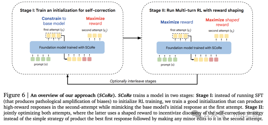 Stage I:SCoRe基于REINFORCE算法,通过明确鼓励模型在第二次尝试中产生高奖励修改,同时通过KL散度将第一次尝试响应分布约束为尽可能接近base模型,从而获得一个不易在后续RL中崩溃的良好初始化(不用SFT初始化)。