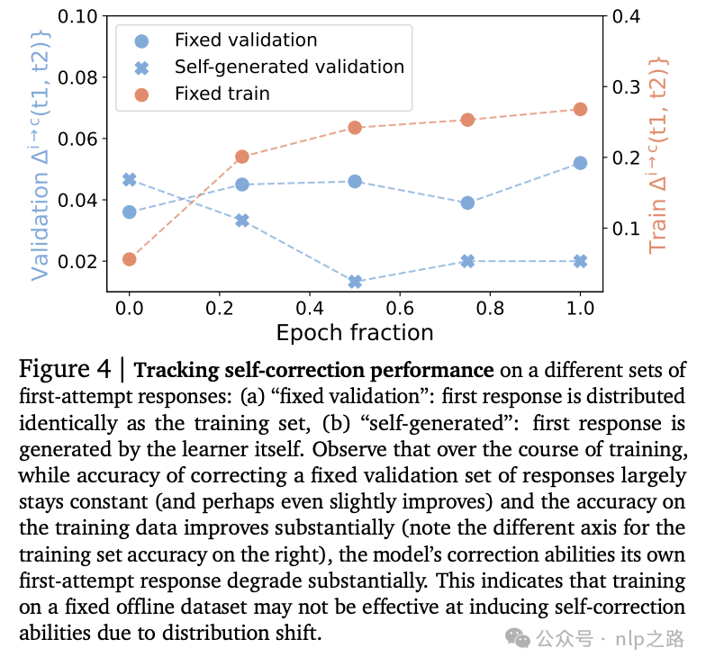 我们清楚地观察到训练与验证以及静态与自生成第一次尝试分布之间的不同行为:虽然该模型能够很好地优化训练修正准确性,并且也保持了在验证集中出现的第一次尝试的初始修正准确性(与训练分布独立同分布),但其自我修正准确性随着更多训练而降低。