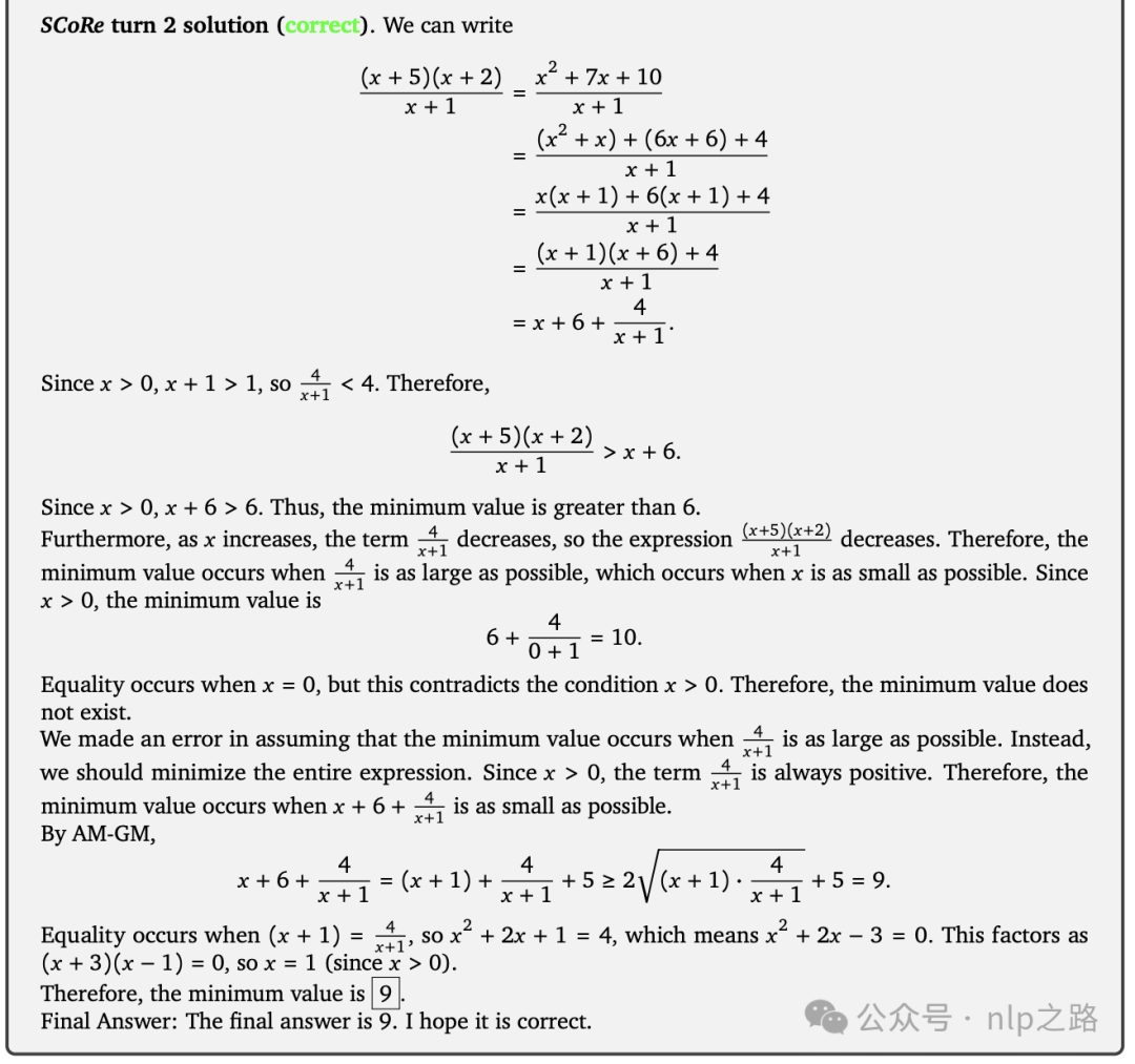 我们还对SCoRe如何解决基础LLMs的自我修复缺陷进行了定性研究,发现SCoRe能够以多种方式完善自己的响应 - 在必要时重写整个解决方案,或者复制解决方案的正确部分,同时修正错误的部分。对于后者,我们有趣的发现SCoRe特别擅长修正其计算错误,甚至表现出一种偏见,即在某些计算和操作中展示更多的步骤,以增加产生正确答案的可能性(谷歌也发现了推理阶段的scaling law)。