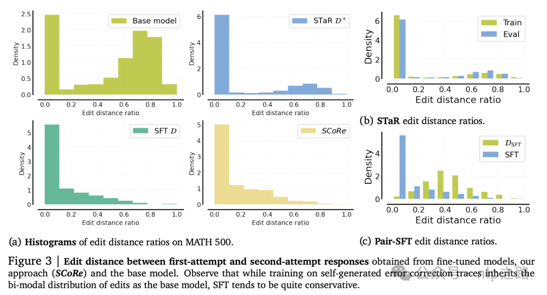 微调的模型过于保守,通常根本不进行编辑。作者还绘制了在训练数据和STaR和Pair-SFT生成的自我修正轨迹中出现的编辑距离比率,并将其与训练和验证问题上的编辑距离比率进行了比较,如图3b和3c所示。虽然STaR在测试集上的泛化性基本跟训练集一致,但Pair-SFT在测试集的泛化不好。