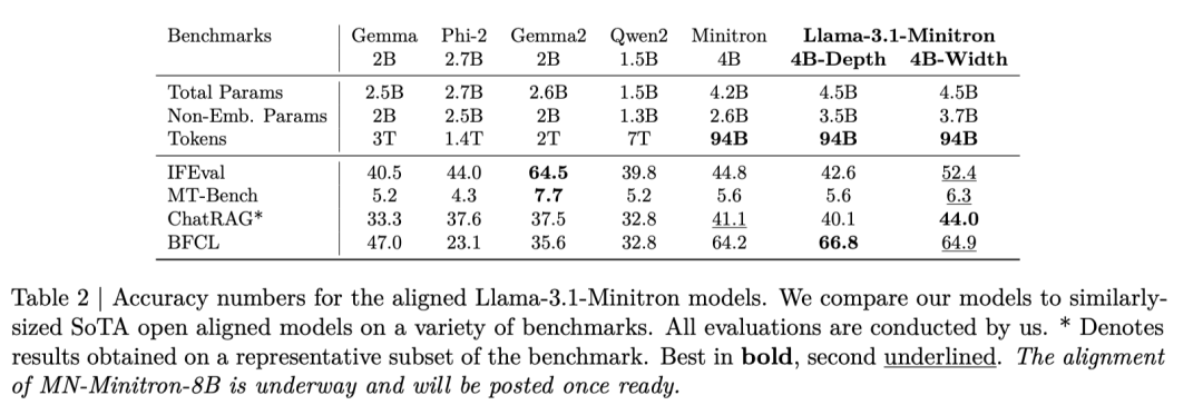 表2展示了指令调优后的Llama-3.1-Minitron 4B变体的性能。与其他同等规模的基准模型相比,Minitron模型在多个任务上表现强劲,特别是在基于检索的问答和函数调用任务上达到了最先进的性能。