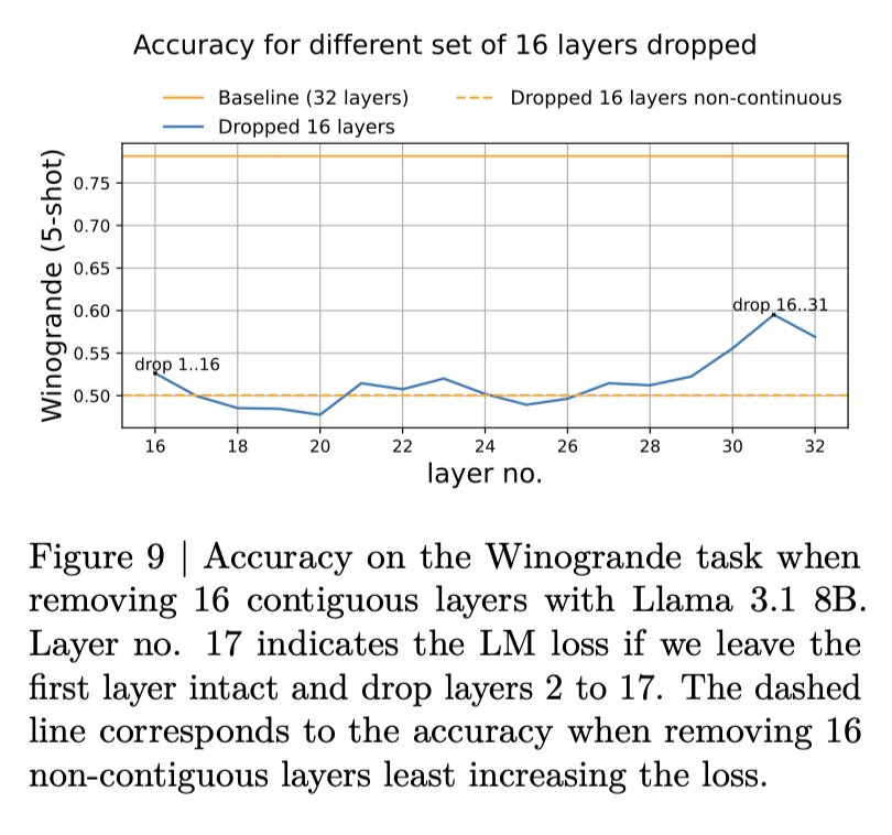 ▲图9|在删除Llama3.1 8B中的16个连续层时Winograde任务的准确性©️【深蓝AI】编译