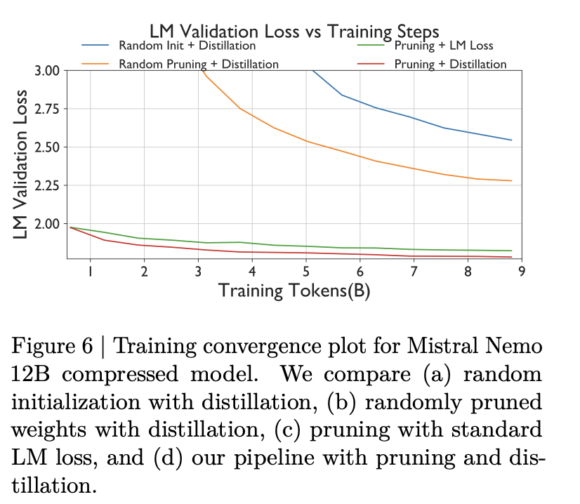 ▲图6|Mistral Nemo 12B压缩模型的训练收敛图:作者比较了(a)随机初始化与蒸馏,(b)随机修剪权重与蒸馏,(c)标准LM损失的修剪以及(d)作者的管道与修剪和蒸馏©️【深蓝AI】编译