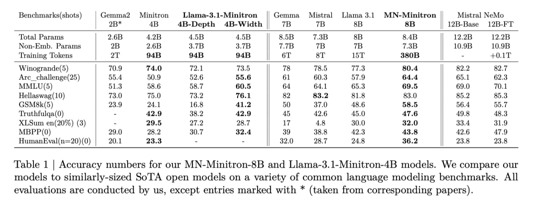 ▲表1|作者团队MN-Minitron-8B和Llama-3.1-Minitron-4B模型的精度数据。作者团队在各种常见的语言建模基准上将作者团队的模型与类似规模的SOTA开源模型进行了比较。除标记为 “*” (来自相应的论文)的条目外,所有评估均由作者团队们执行©️【深蓝AI】编译●MN-Minitron-8B和Llama-3.1-Minitron 4B模型在各项任务中表现出色,且仅使用了原模型极小部分的训练数据。